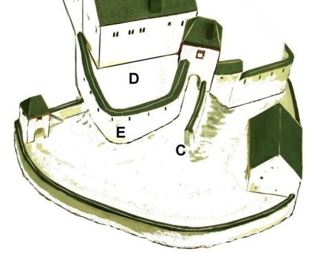 Der eingeschlossene Hof (D) diente der Verteidigung.