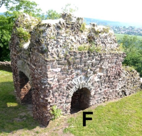 Die vorgeschobene Ringmauer (E) verläuft parallel zum Fahrweg. Über einen Wehrgang an der Innenseite der Ringmauer konnte man den steil aufsteigenden Burgweg und die Vorburg kontrollieren und verteidigen.