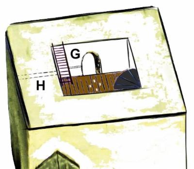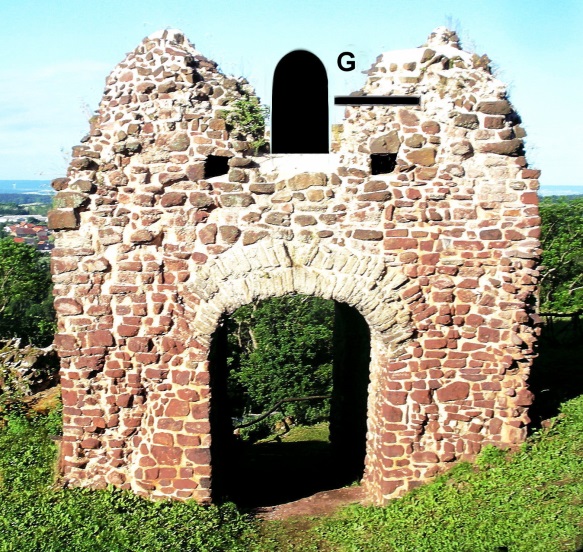 Auch diese Tür wurde mit einem Balkenriegel gesichert. Dieser Balkenschacht (G) befindet sich auf der rechten Türseite und er hat die Maße: