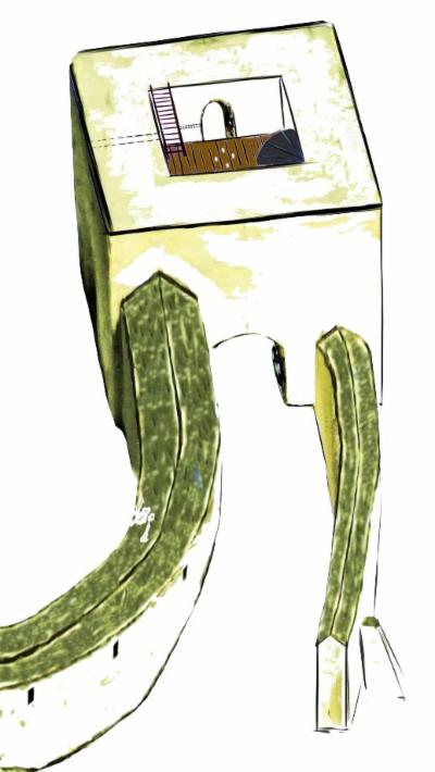 Durch eine zusätzliche Mauerwange (C) wirkt der Zugang am Tor 2 wie eine längs aufgeschnittene Trichterröhre. Der so entstandene schmale Zugang am Tor 2 begünstigt bei einem Angriff die Verteidigung an diesem Einlass.