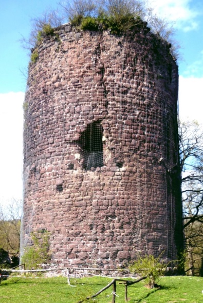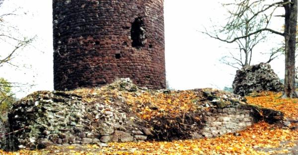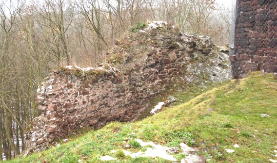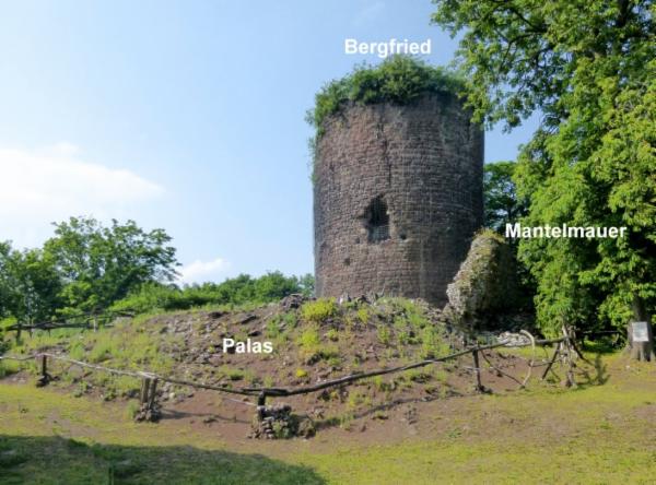 Die Reste der Kernburg mit dem Palas, dem Bergfried und der Mantelmauer.