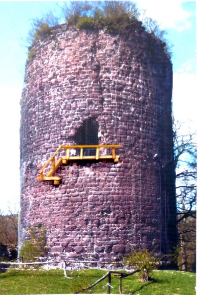 Vom Wirtschaftsgebäude erreichte man über Holzstege in einer Höhe von ca. 7 m den Eingang zum Bergfried.