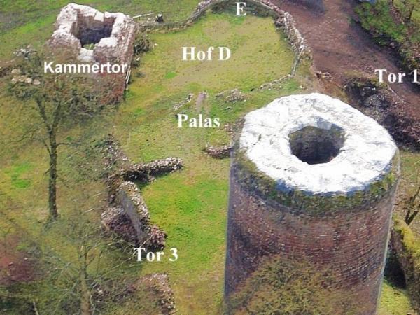 Die Vogelperspektive zeigt das Kammertor mit der vorgeschobenen Ringmauer (E) und den Hof (D), die Reste vom Palas, die Mantelmauer mit dem Tor 3 und den Bergfried.