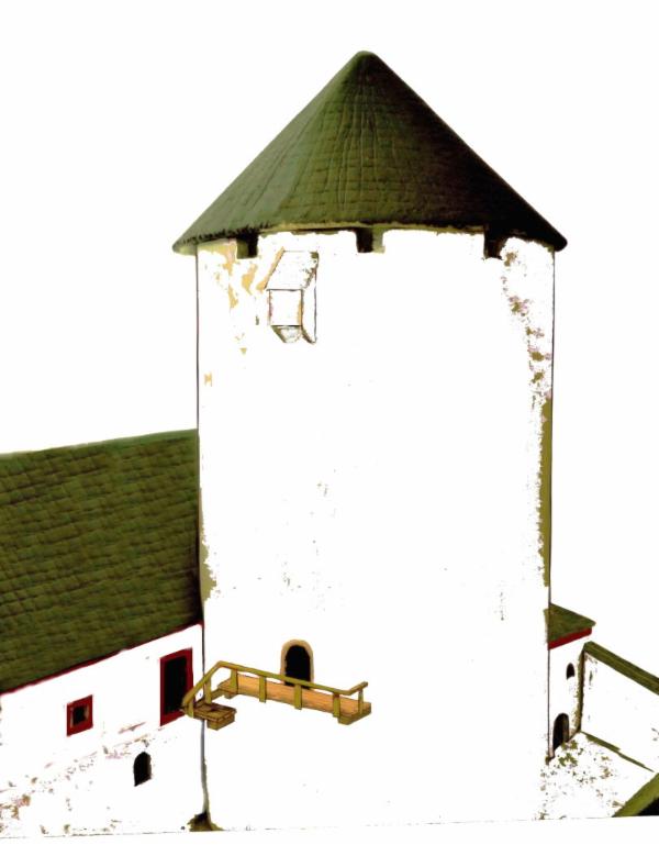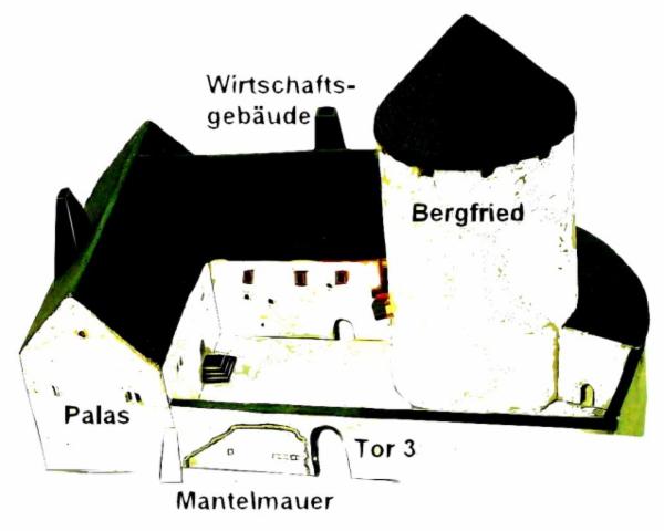Der Bergfried hat keine Fenster. Die jeweiligen Etagen hatten eine Höhe von ca. 3m. Über Leitern oder Stiegen erreichte man die übereinander angebrachten Räume bis zur oberen Etage. Diese war wahrscheinlich zur Verteidigung oder für Wohnzwecke ausgebaut. Im Modell wurde eine Überdachung für den Bergfried ausgewählt. Der Bergfried wurde vermutlich in einer dreijährigen Bauzeit fertiggestellt. Durch unterschiedliche Mörtelfärbung am Bergfried lassen sich drei Abstufungen erkennen. Gebaut wurde in der frostfreien Zeit von Mitte Mai (nach der kalten Sofie) bis Anfang Oktober. Die vorbereitenden Arbeiten wurden aber ganzjährig durchgeführt.