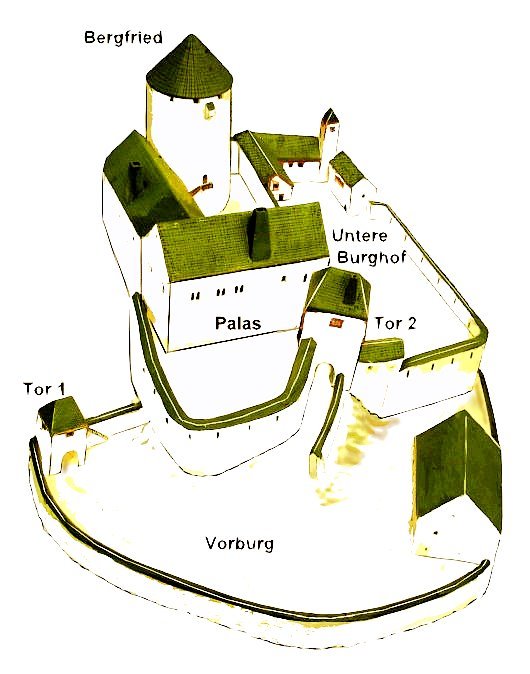 Der Burgweg führt durch das Tor 1 in die Vorburg. Über einen steilen Anstieg erreicht man das Tor 2. Weiter geht es durch den unteren Burghof zum Tor 3. Dann gelangt man in die Kernburg mit dem oberen Burghof, dem Palas und dem Bergfried.